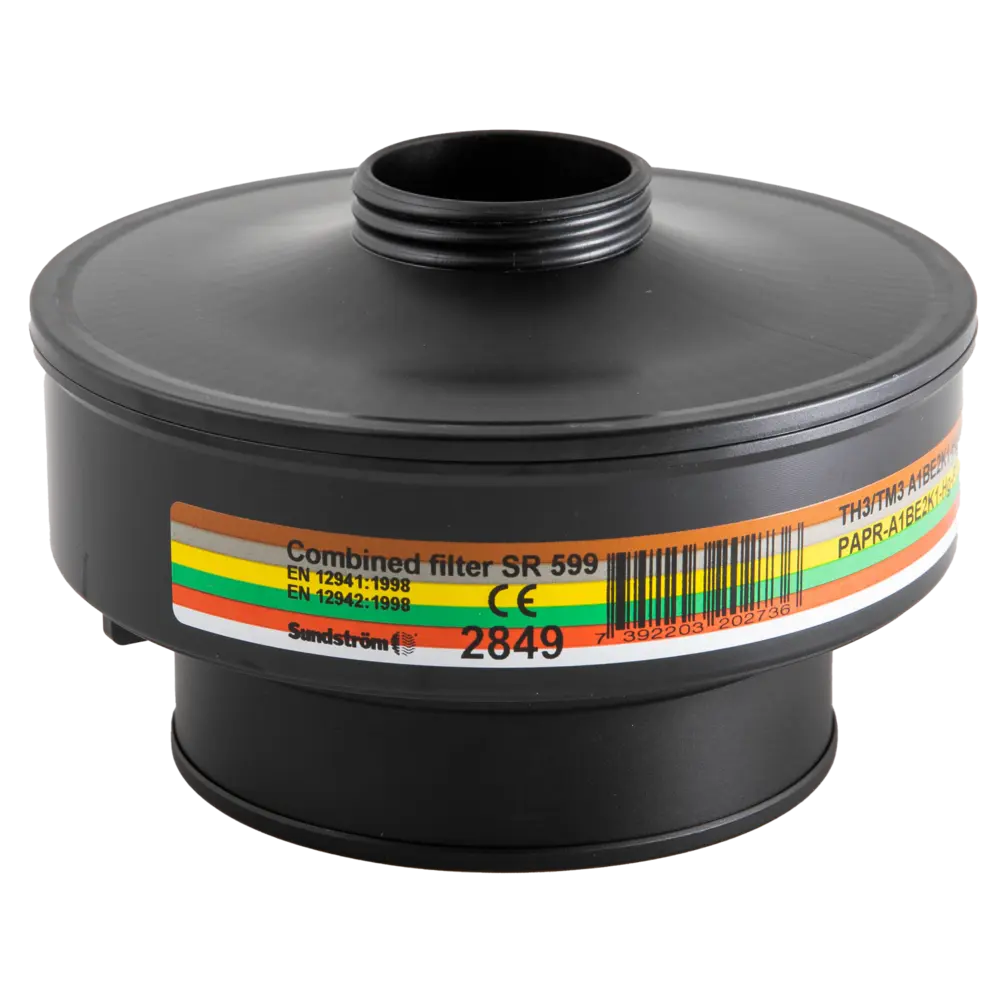 Kombinationsfilter SR 599 är avsett för användning tillsammans med fläkt SR 500/SR 500 EX. Typ A skyddar mot organiska gaser och ångor, t ex lösningsmedel, vars kokpunkt överstiger +65 °C. Typ B skyddar mot oorganiska gaser och ångor, t ex klor svavelväte och cyanväte. Typ E skyddar mot sura gaser och ångor, t ex svaveldioxid och fluorväte. Typ K skyddar mot ammoniak och vissa aminer, t ex etylendiamin. Typ Hg skyddar mot kvicksilverånga. Varning. Användningstiden är begränsad till 50 timmar. Typ P3 R* skyddar mot alla typer av partiklar, både fasta och flytande.